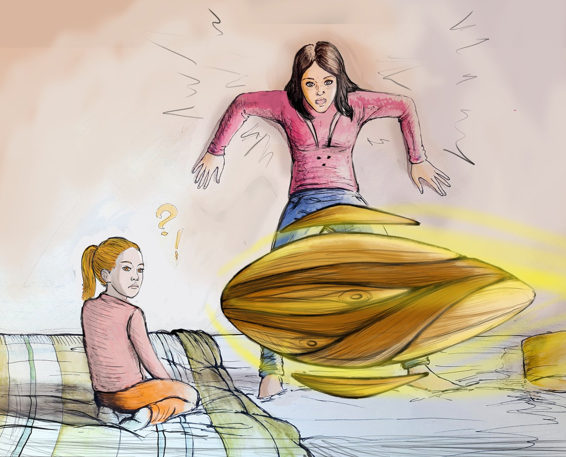 The ship hovered just above the house, beams of light pulsing rhythmically. In an instant, the room was awash in a soft glow as the vessel's scanners locked onto Laura and Sofia. The girls froze, their laughter giving way to wide-eyed awe. Within moments, an eye shape vessel floated across them, reading their forms, memories, and essence. Then, just as quickly as it had come, the ship vanished, darting back to the vastness of space.